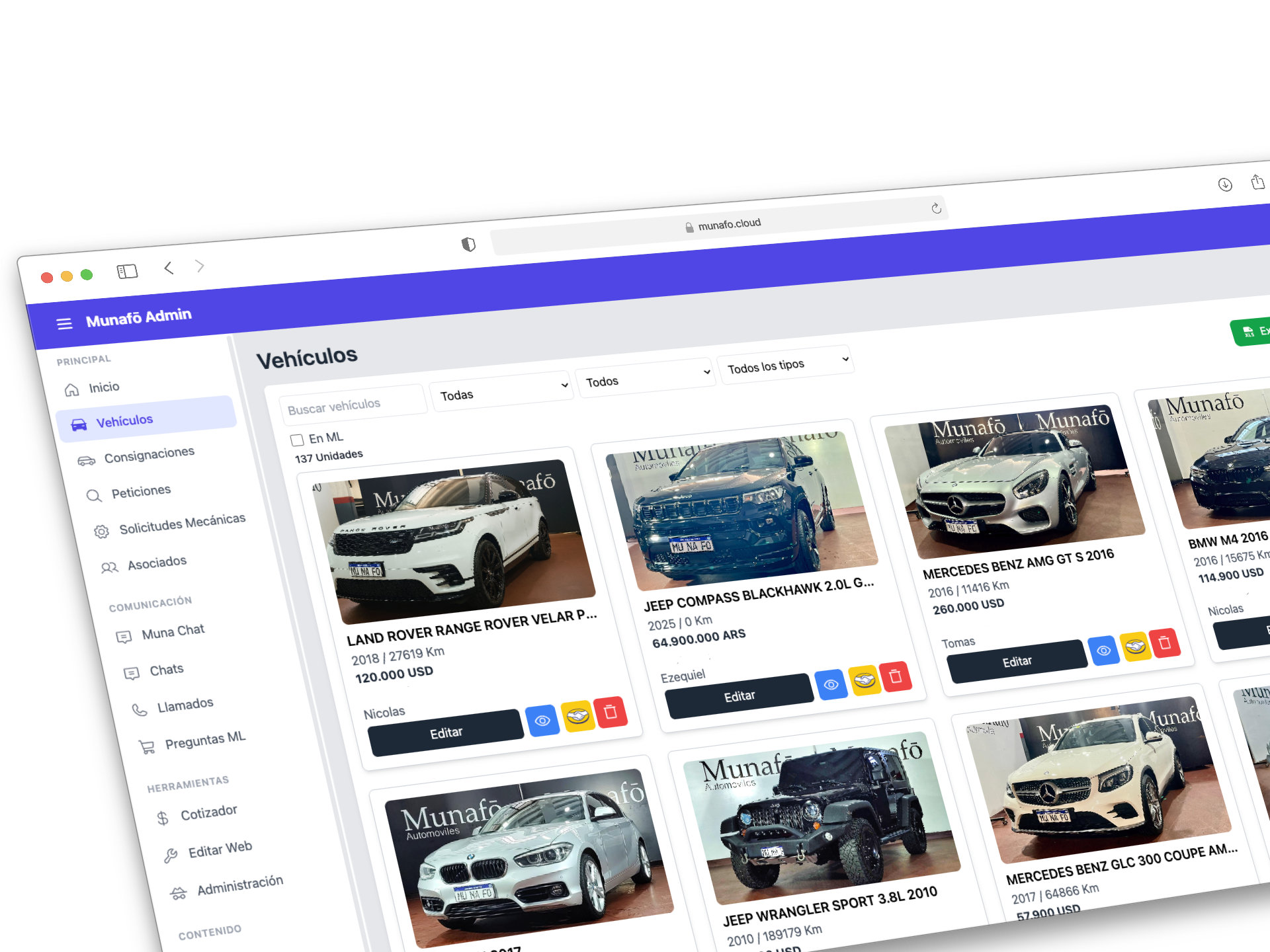 Se desarrolló un sistema de administración a medida que centraliza la gestión de vehículos. Permite cargar, editar y controlar el stock de manera sencilla, con actualizaciones automáticas en Mercado Libre y publicación en redes sociales como Instagram, Facebook y WhatsApp.